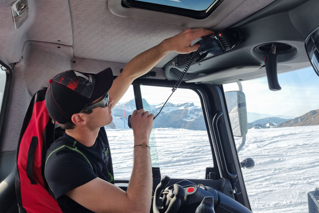 Nachdem der Grundstein für den Umstieg auf digitale Funkkommunikation mit dem Aufbau eines Betriebsfunknetzes Ende 2024 gelegt war, zündete die nächste Stufe der Modernisierung im Frühjahr 2025 mit einem einfachen Test: Ein Telox-M6-Gerät wurde probeweise in ein Pistenfahrzeug integriert. Gemeinsam mit dem Team von PdS suchten wir den optimalen Einbauort – vibrationsarm, sicher zugänglich und für die Maschinisten auch bei Dunkelheit und Handschuhen intuitiv bedienbar. Eine nächtliche Testfahrt auf über 2000 Meter bestätigte, was wir erhofft hatten: klare Funkverbindungen, stabile GPS-Lokalisierung und eine einfache Bedienung, die sofort überzeugte.