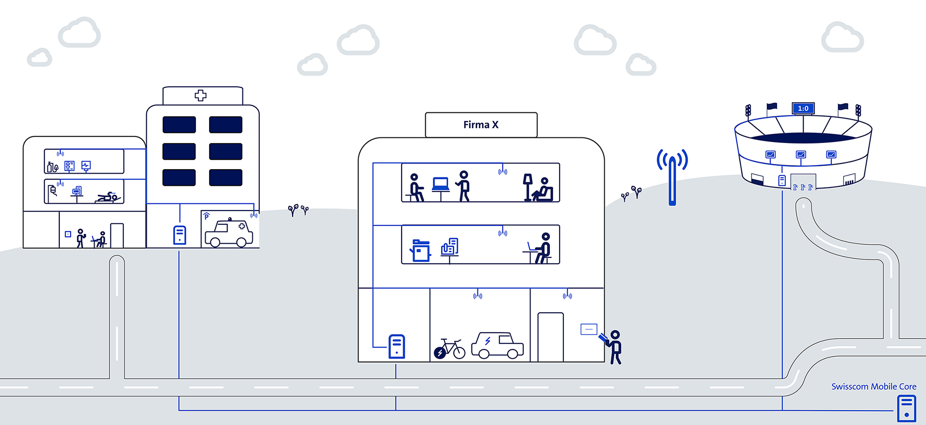 Die Basisstation befindet sich bei Ihnen vor Ort und ist durch Glasfaserleitungen mit einer Telefonzentrale von Swisscom verbunden. Das Signal wird über ein passives oder aktives Antennennetzwerk im Gebäude verteilt. Swisscom stellt dedizierte Leitungen und eine vollumfängliche Infrastruktur zur Verfügung, um eine optimale Performance der Installation sicherzustellen.