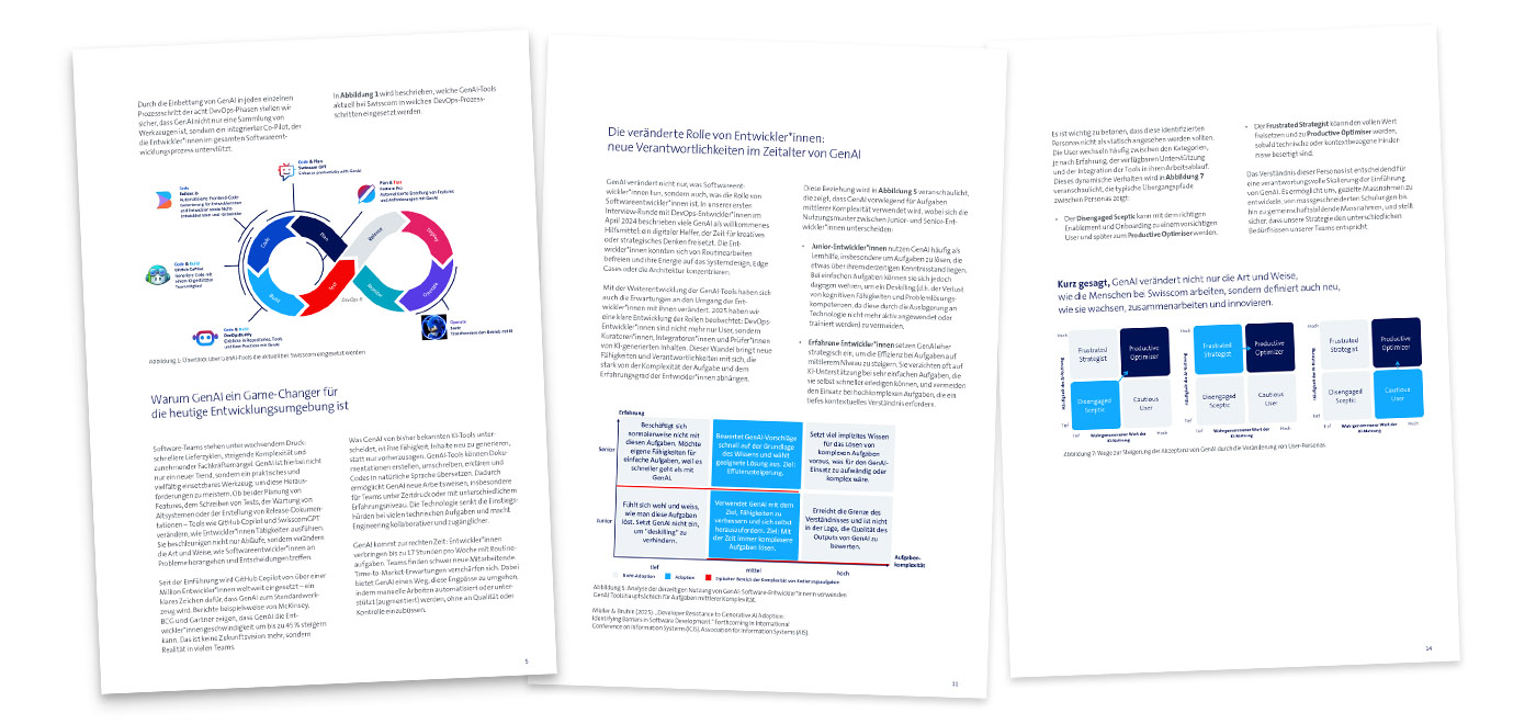 Wir haben gemeinsam mit dem Institut für Wirtschaftsinformatik der Universität St. Gallen (IWI-HSG) untersucht, wie Software-Entwickler*innen GenAI nutzen und den Wandel durch künstliche Intelligenz erleben. Das Whitepaper liefert auch branchenübergreifend Inspiration, da es die wichtigsten Schritte der GenAI-Transformation aufzeigt; von der Experimentierphase über die Workflow-Integration bis hin zu neuen Rollenbildern und Aufgaben im Unternehmen. Schliesslich hat die Studie verschiedene Nutzungsmuster mit GenAI identifiziert.