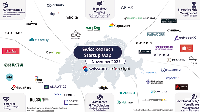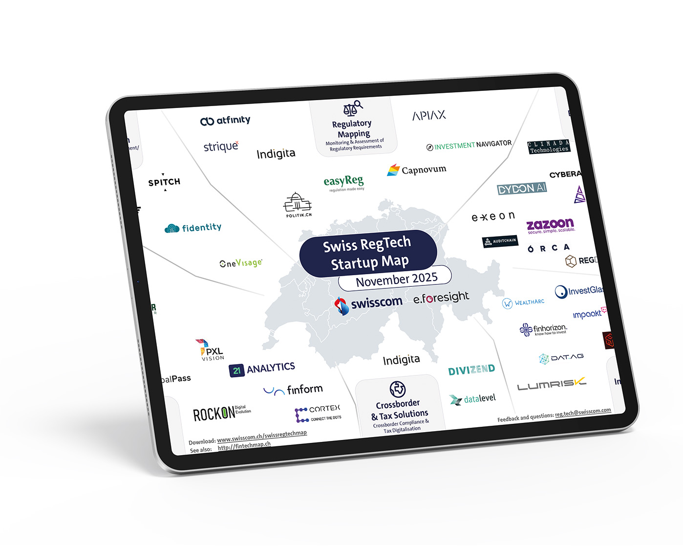 Quartalsweise veröffentlicht Swisscom zusammen mit e.foresight eine Marktübersicht der Schweizer RegTech Startups mit einer Kategorisierung nach Handlungsfeldern. Folgende Handlungsfelder stehen im Fokus: