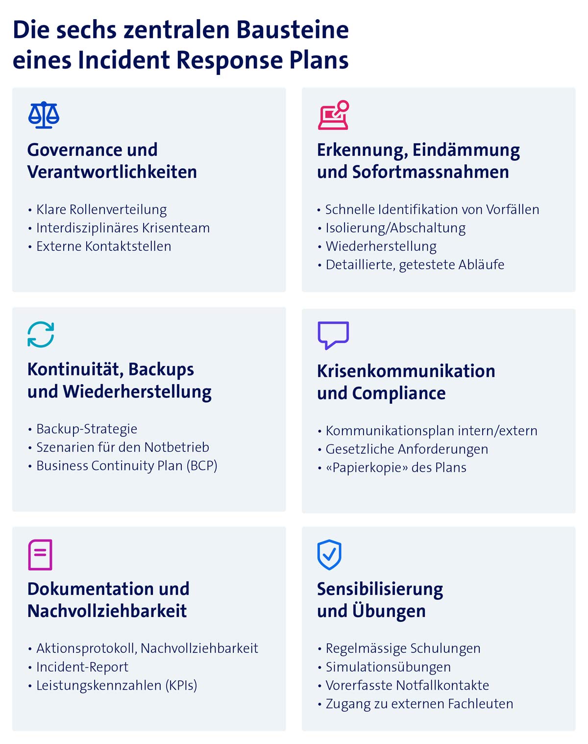 Die Vorbereitung ist das A und O der Incident Response. Unternehmen, die gut vorbereitet sind, haben bessere Chancen, den Schaden bei einem Cybervorfall einzudämmen. Dazu gehört, nicht nur einen Notfallplan zu besitzen und aktuell zu halten, sondern die Szenarien auch regelmässig zu üben. «Eine realitätsnahe Simulation einer Cyberkrise beinhaltet, dass das Krisenteam die volle Bandbreite seiner Zuständigkeiten wahrnimmt. So wird sichergestellt, dass auch dem Management die Tragweite eines Cyberincidents bewusst wird.», betont Holzhauser.