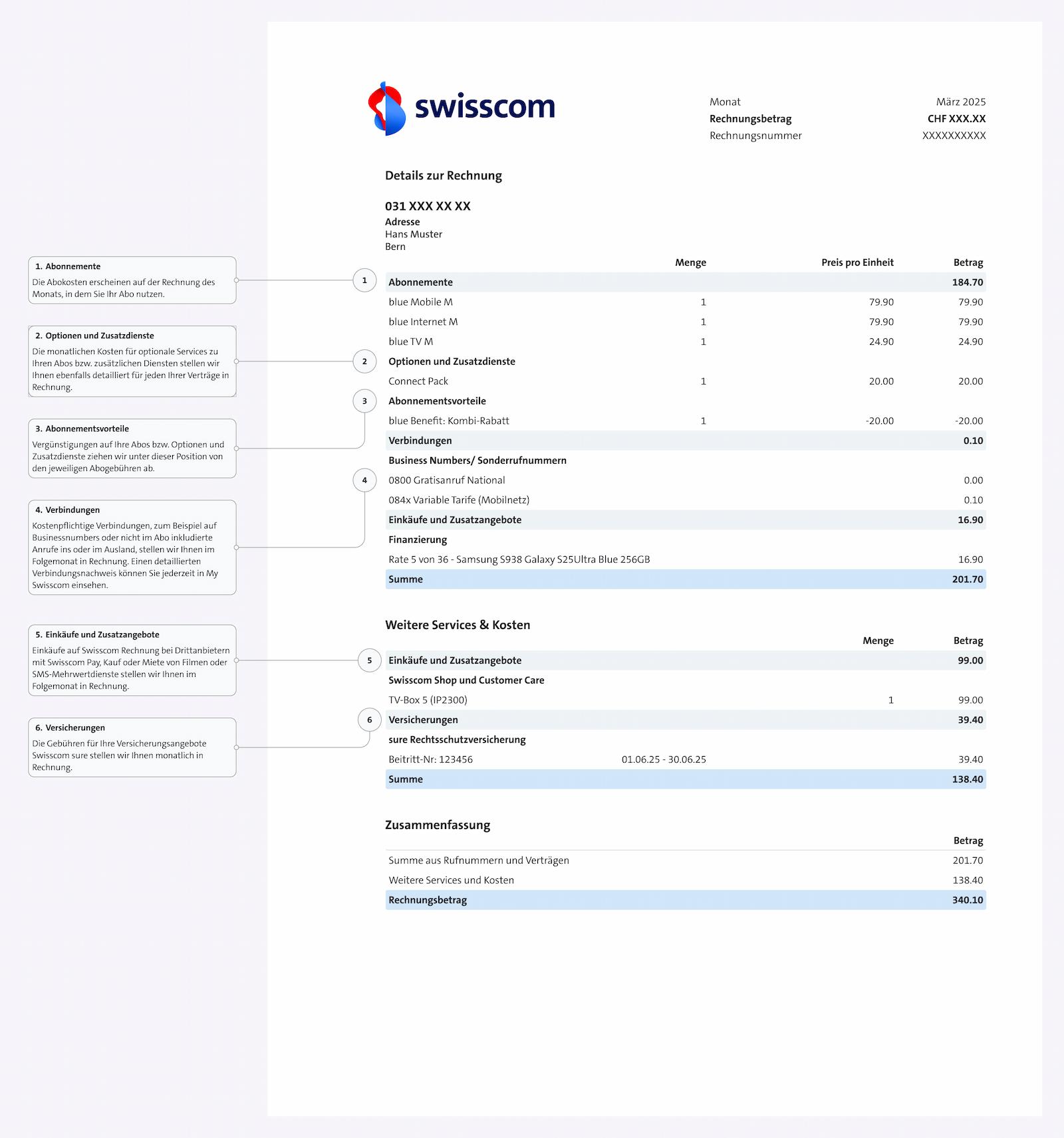 Ab Seite 3 (siehe Beispiel-Abbildung) Ihrer Swisscom Rechnung schlüsseln wir Ihnen die monatlichen Gebühren für Ihre Mobile-, Internet-, TV- und weiteren Abos detailliert nach folgenden Positionen auf: