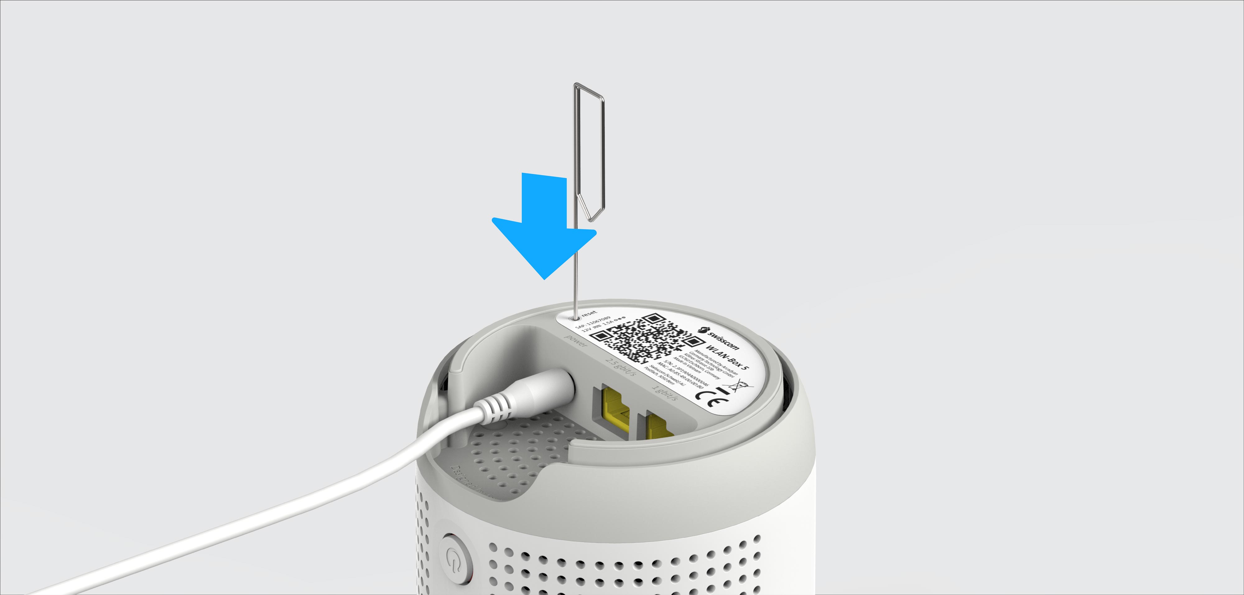 | LED leuchtet blau: | Defekte WLAN-Box 5. Bitte kontaktieren Sie Swisscom für einen Austausch. Hinweis: Beim Startvorgang leuchtet die LED vorübergehend blau. Warten Sie 5 Minuten, bis der Start abgeschlossen ist. |