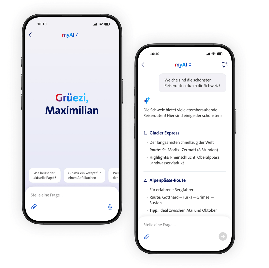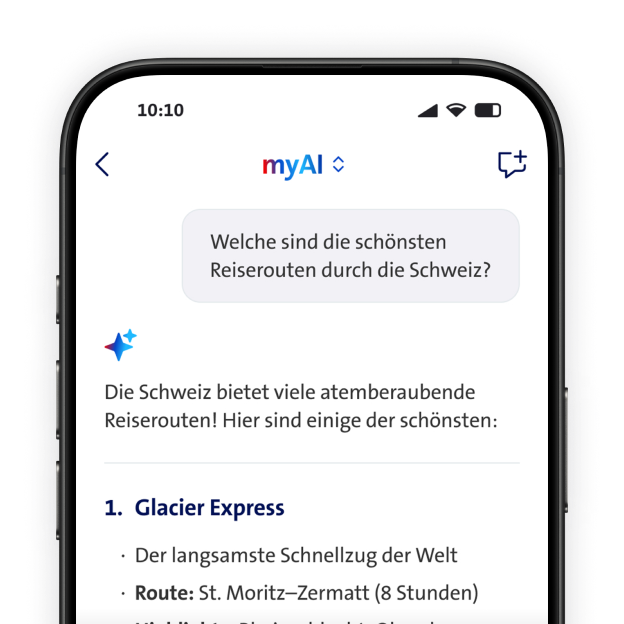 myAI ist Ihr persönlicher KI-Assistenten – entwickelt von Swisscom für die Schweiz. Sie können mit myAI ganz natürlich sprechen oder schreiben und Ihnen bei vielen Aufgaben helfen lassen: Texte verfassen und übersetzen, Informationen zusammenfassen, Ideen entwickeln, E-Mails schreiben, Fragen beantworten – und vieles mehr.