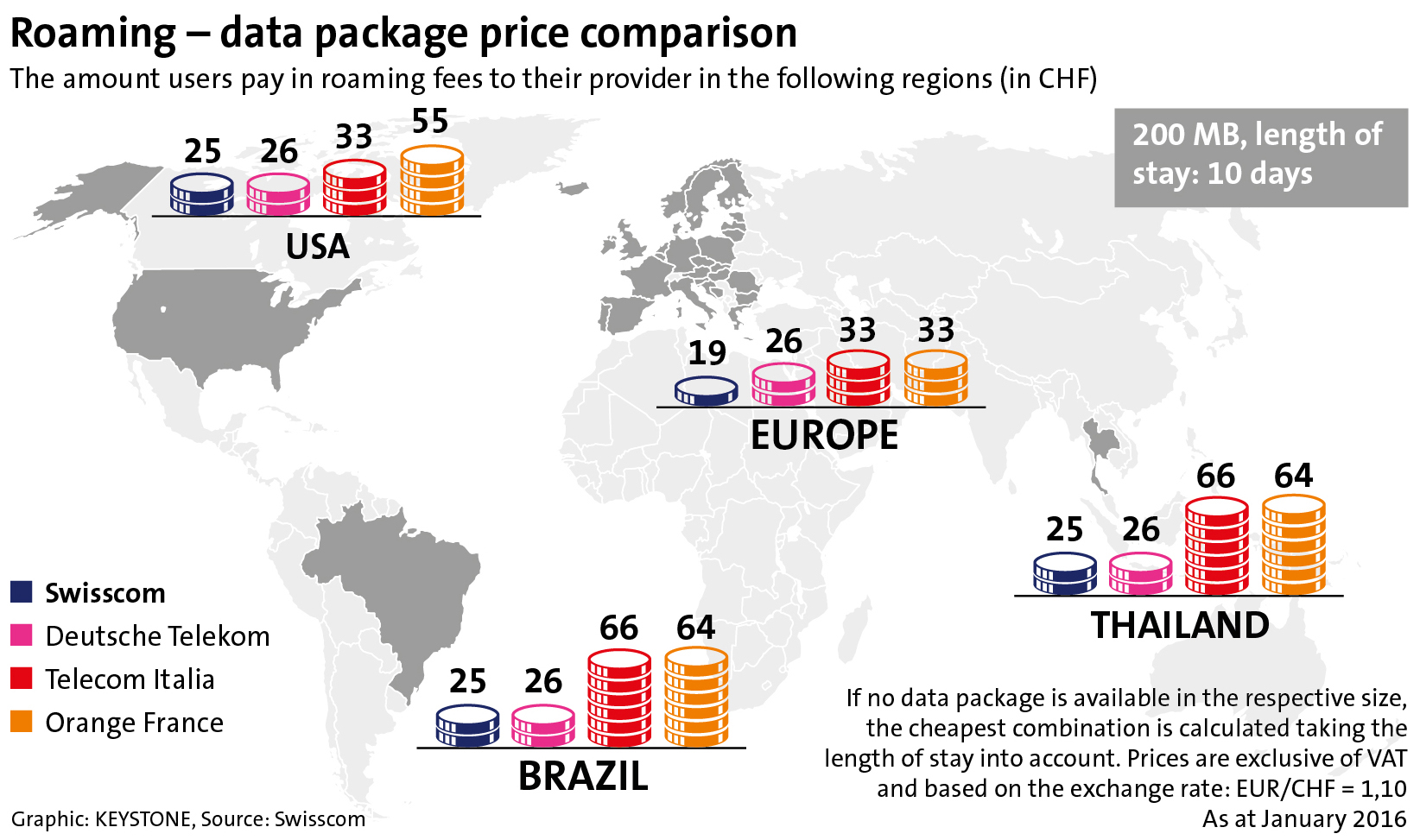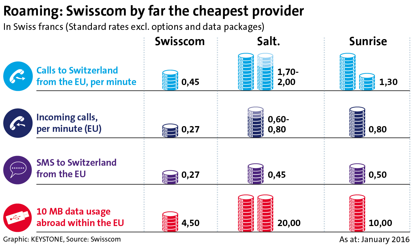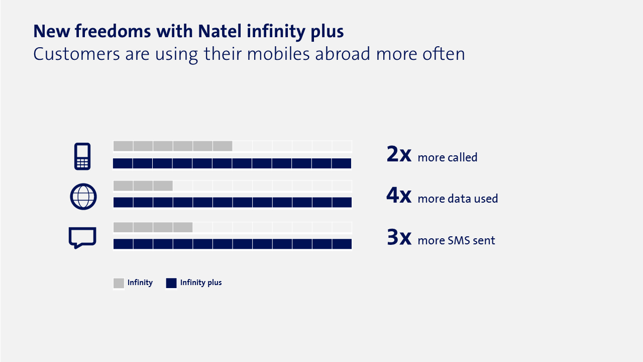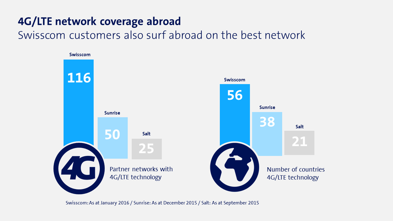 Since the launch of the improved infinity plus subscriptions in April 2015, customers have used their mobile phones for more than ten million travel days in the EU. And they are already benefiting from 67 partner networks with fast 4G / LTE technology. Worldwide, that number increases to 116. Compared to its Swiss competitors, Swisscom offers the best overall network coverage abroad and is also at the front of the pack worldwide. And Swisscom customers in Switzerland also have the best network: In December 2015, Connect magazine named Swisscom the best network in Switzerland in its mobile network test for the seventh time in a row and the best network in Germany, Austria and Switzerland for the second time running.