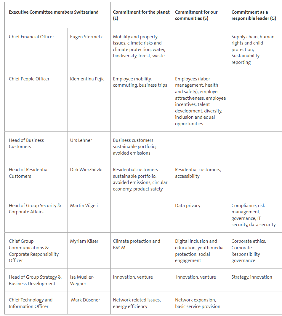The members of the Group Executive Board are entitled to a variable performance-related salary component, which includes sustainability indicators based on employee satisfaction, diversity, CO2 reduction and energy efficiency improvements. Further details on Swisscom’s incentive scheme and sustainability-related performance metrics are available in the Renumeration Report.