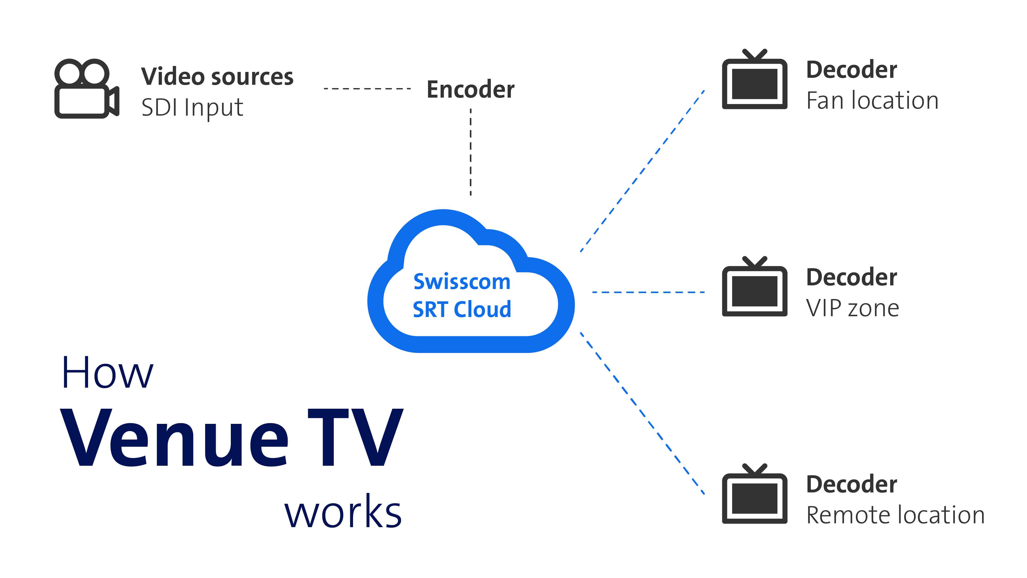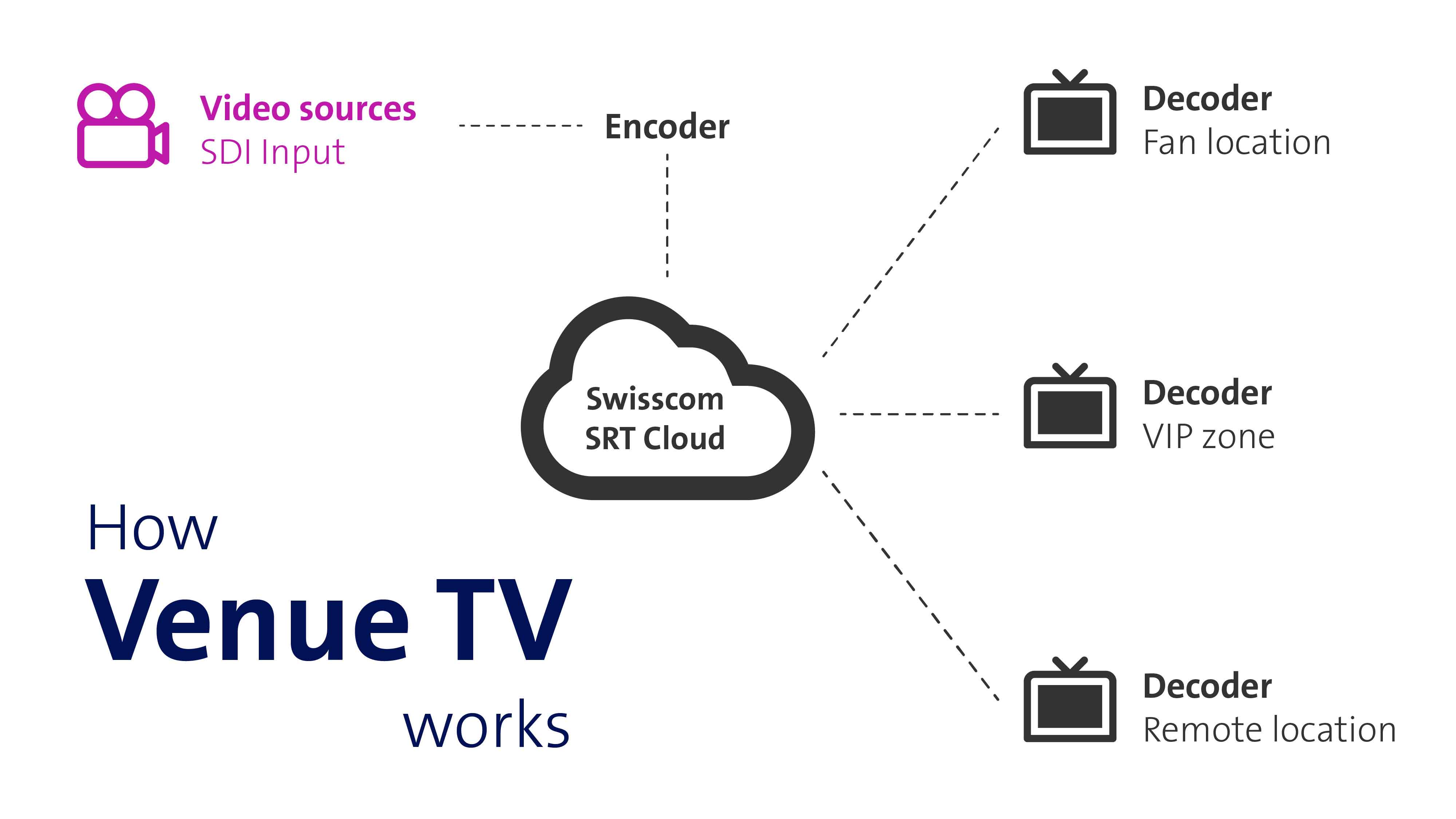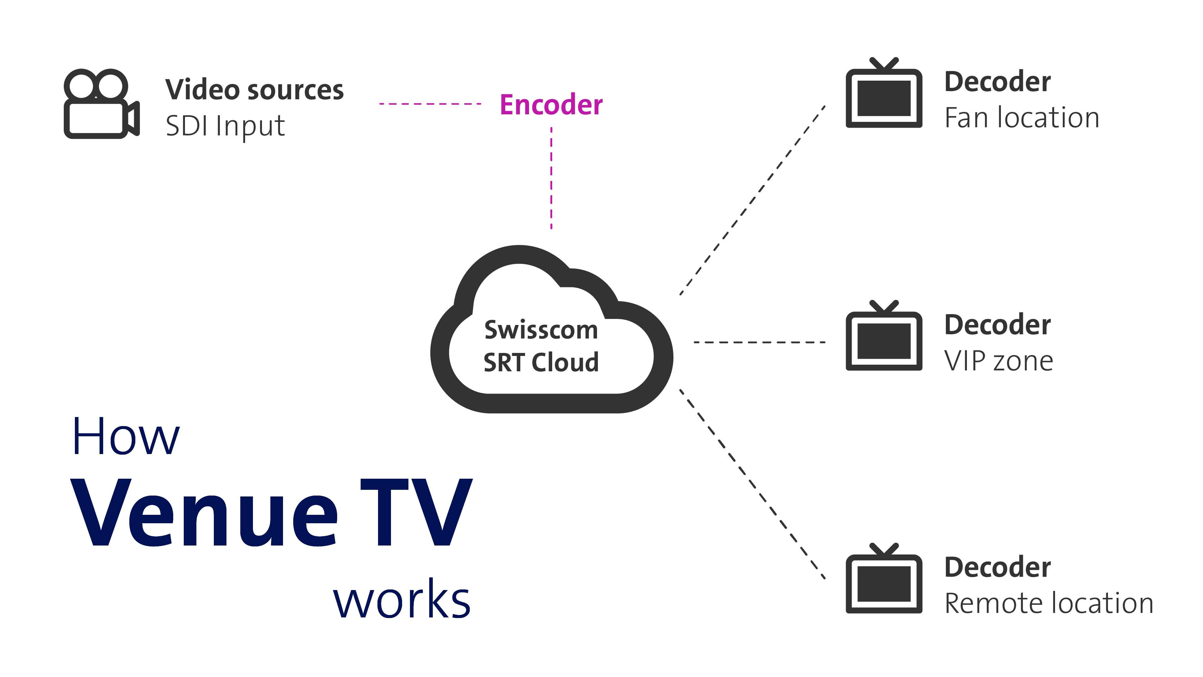 Our Swisscom SRT gateway transports your video streams reliably and with very low latency between different locations. Whether in stadiums, VIP areas, fan locations or remote production facilities, all signals run centrally via a secure, nationwide network with redundant connections and failover systems, guaranteeing you maximum reliability and bandwidth for professional broadcast-quality transmissions.