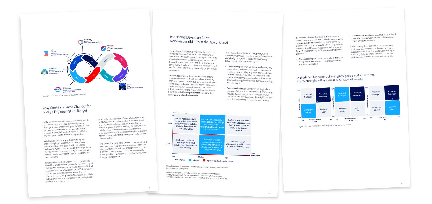 Together with the Institute of Information Systems and Digital Business (IWI-HSG) at the University of St. Gallen, we have investigated how software engineering use GenAI and experience the transformation through artificial intelligence. The whitepaper also provides inspiration across industries, as it shows the most important steps of the GenAI transformation; from the experimental phase to workflow integration and new role models and tasks in the company. Finally, the study has identified different usage patterns with GenAI.