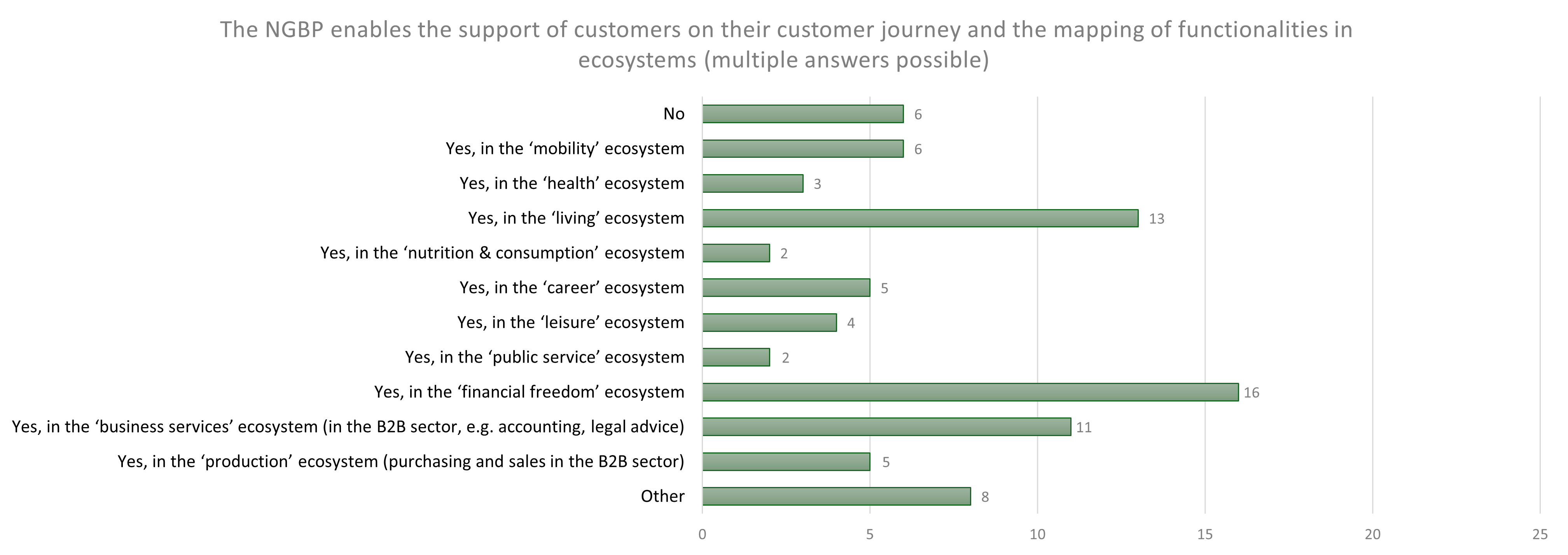 The survey shows a strong tendency to expand the role of the bank beyond traditional financial services. A clear majority expects the NGBP to enable the support of customers throughout their entire ‘customer journey’, facilitating integration into different areas of life – so-called ecosystems. The areas most frequently mentioned were ‘living’, ‘financial freedom’ and ‘business services’ (in the B2B sector, e.g. accounting, legal advice, etc.). This underscores the expectation that banking transactions will in future be seamlessly integrated into broader contexts such as real estate purchases, retirement provision and corporate governance. In the ecosystems of health, nutrition & consumption and public service, only a minority of respondents expect the integration of services in such a way.