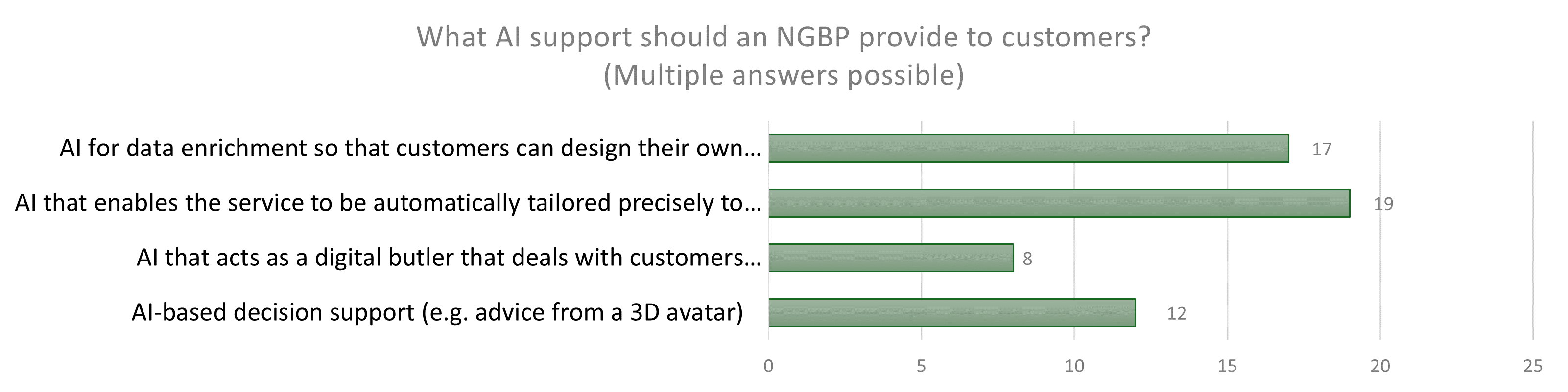 From the customer’s point of view, AI should primarily contribute to personalisation. The most frequently mentioned requirement is an AI system that makes it possible to ‘automatically tailor the service precisely to the customer’. Enabling customers to design their own services through data enhancement is also highly regarded. AI is seen as a tool for strengthening customer autonomy and creating a personalised banking experience, for example through digital assistants or advisory avatars. Only a handful of people expect AI to take the form of a digital butler that deals with customers independently of their banks.