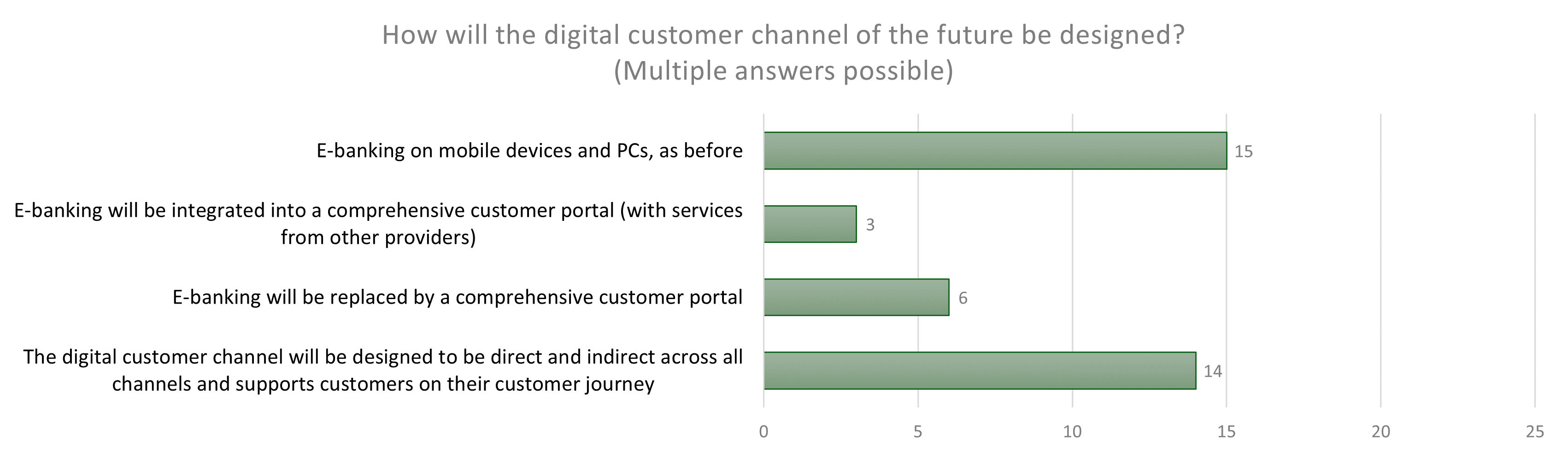 The outlook for digital access in the future is mixed. Although traditional e-banking on mobile devices and PCs will continue to play a role, almost as many respondents expect a cross-channel, integrated customer experience in the future. Interaction with the bank should no longer be limited to an app or website, but should take place directly (interaction with the bank) and indirectly (integrated with partners, visible or invisible to customers) wherever the customer needs it. However, only a minority expect a comprehensive customer portal for the entire customer relationship, with features such as product management across all divisions (including integrated services), multi-banking capability (integration of accounts from other banks), budget tools and self-service, e.g. for making appointments.