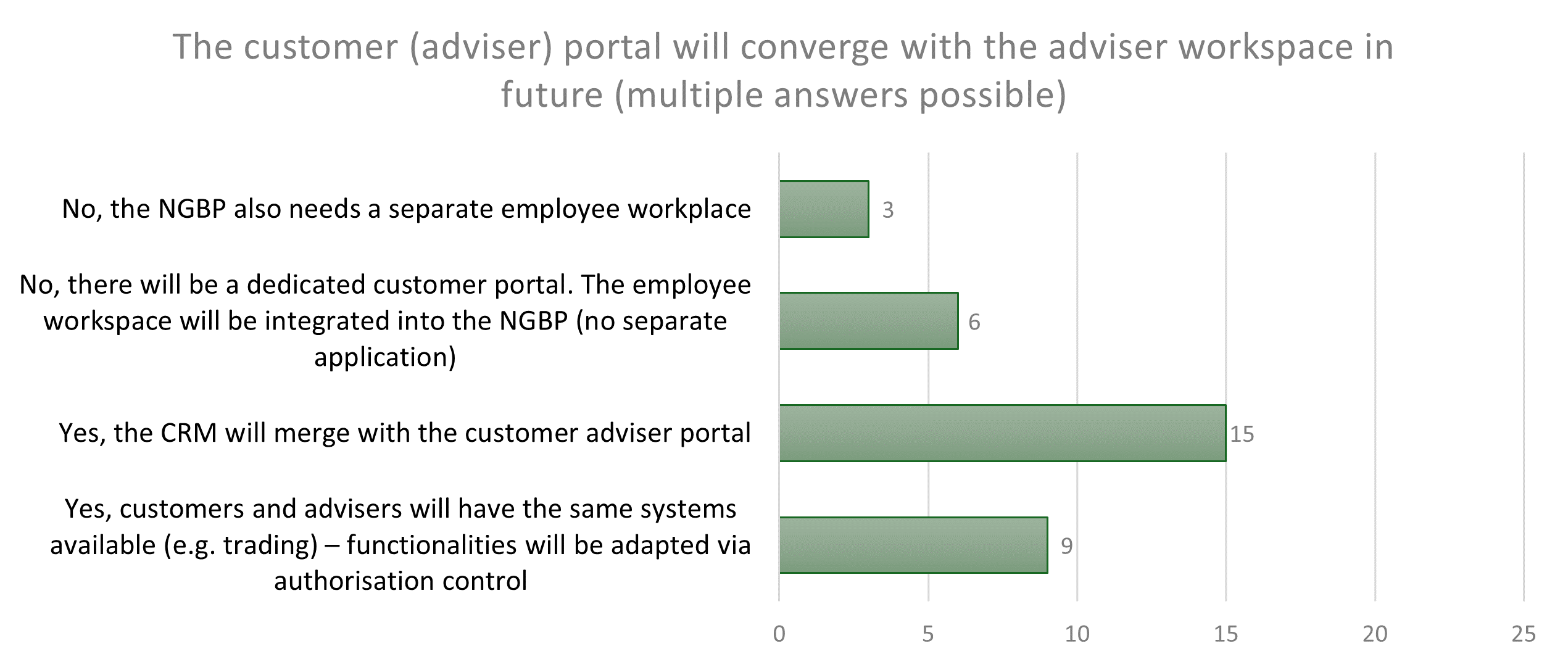 Some respondents were in favour of a uniform solution where customers and advisers – controlled by permissions – access the same systems in order to promote transparency and collaboration. A slightly smaller group advocated for dedicated, separate systems, as the requirements and complexity of the tasks were too different for employees and customers.