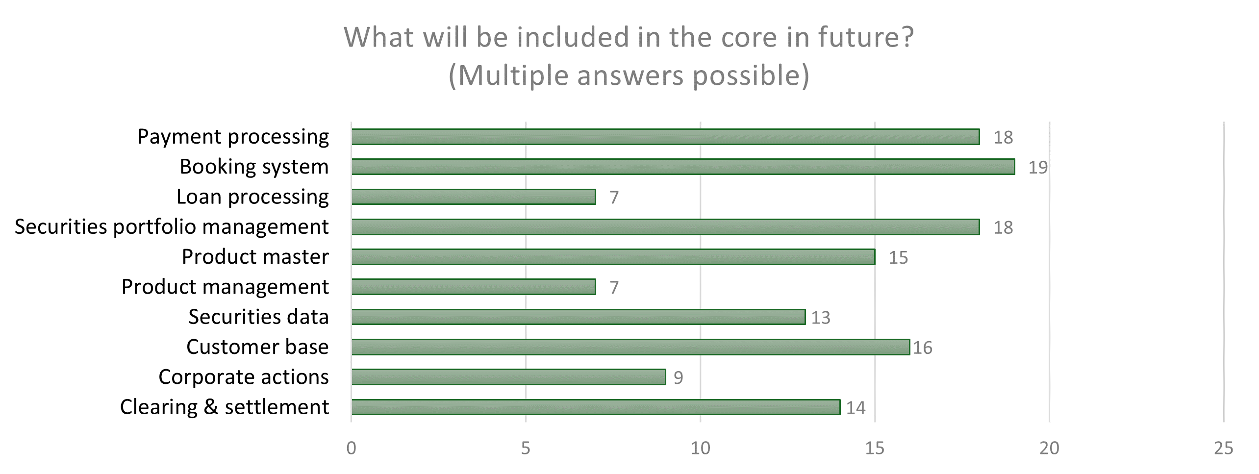 The era of all-encompassing core banking systems is coming to an end. The survey results indicate a consensus that the ‘core’ of the future will be reduced to its essential functions. These undoubtedly include the booking engine for items that can be included in the balance sheet (general ledger) as a ‘single source of truth’ and customer account management with all transactions and securities account management (subledger).