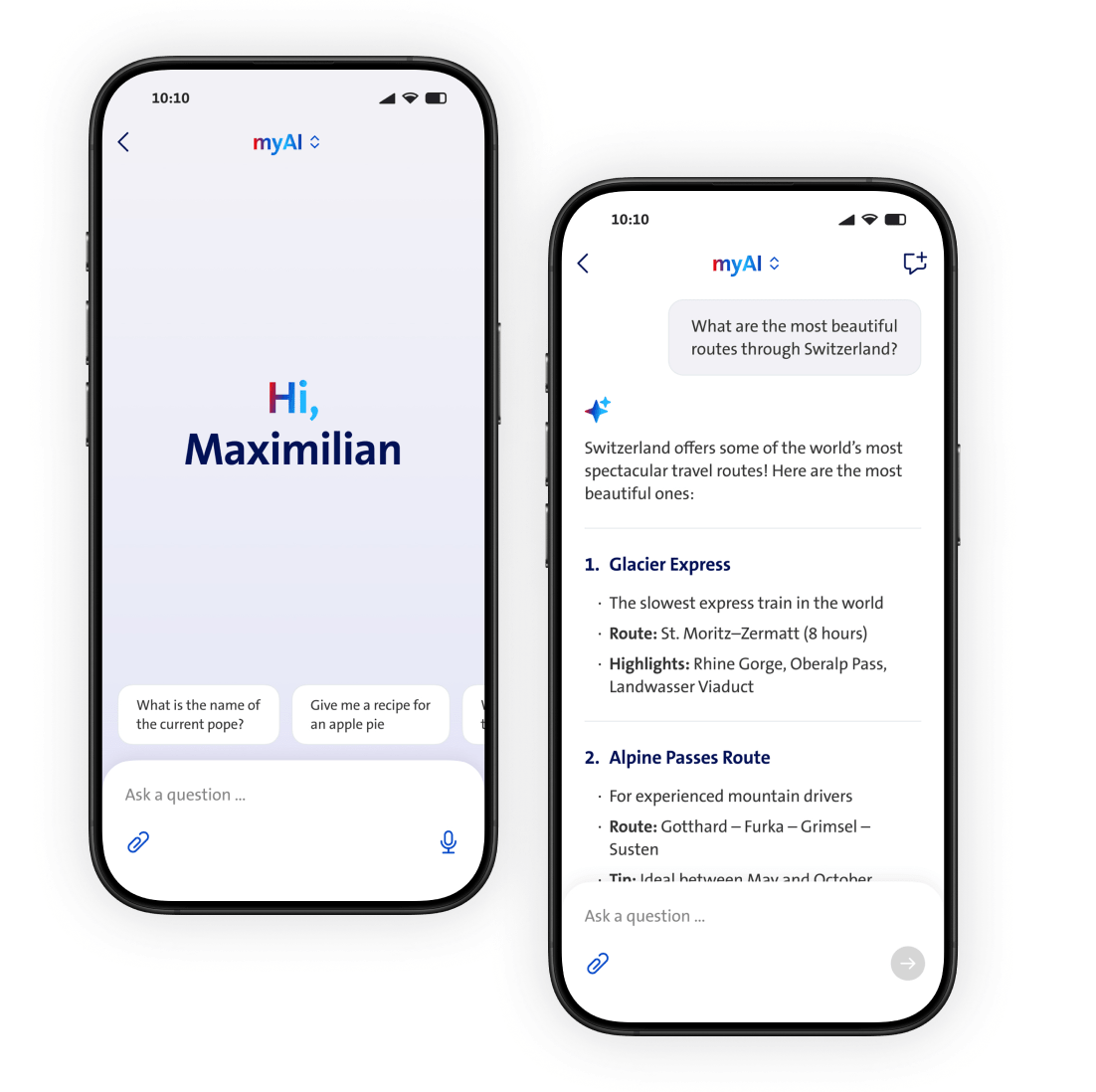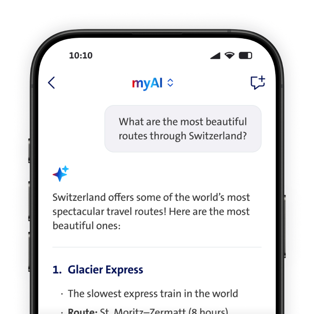 myAI has been specially developed by Swisscom for Switzerland. It offers an optimised user experience for the Swiss market, recognises local contexts and processes your data exclusively in Switzerland and the EU. What’s more, none of the information you enter will be used to train the AI.