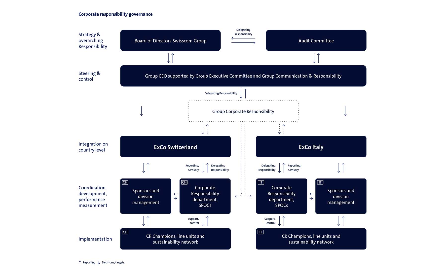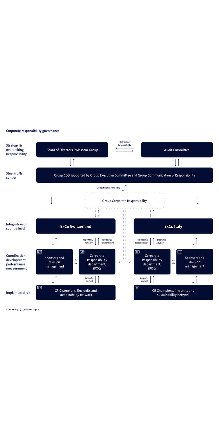 La Suisse et l'Italie disposent toutes deux d'un département Corporate Responsibility au niveau national afin de garantir la mise en œuvre de la stratégie de développement durable du groupe et une mesure appropriée des performances, et de fournir l'expertise nécessaire pour permettre aux filiales et aux unités commerciales d'atteindre leurs objectifs en matière de développement durable. Pour chaque unité commerciale de Swisscom (par exemple B2C), des points de contact uniques (SPOC) sont désignés ; ceux-ci sont les interlocuteurs de la direction de la division et des champions de la Corporate Responsibility (CR) dans toutes les unités commerciales pour la coordination du programme de développement durable. Les départements Corporate Responsibility en Suisse et en Italie collaborent étroitement sur les questions de développement durable afin de tirer parti des synergies.