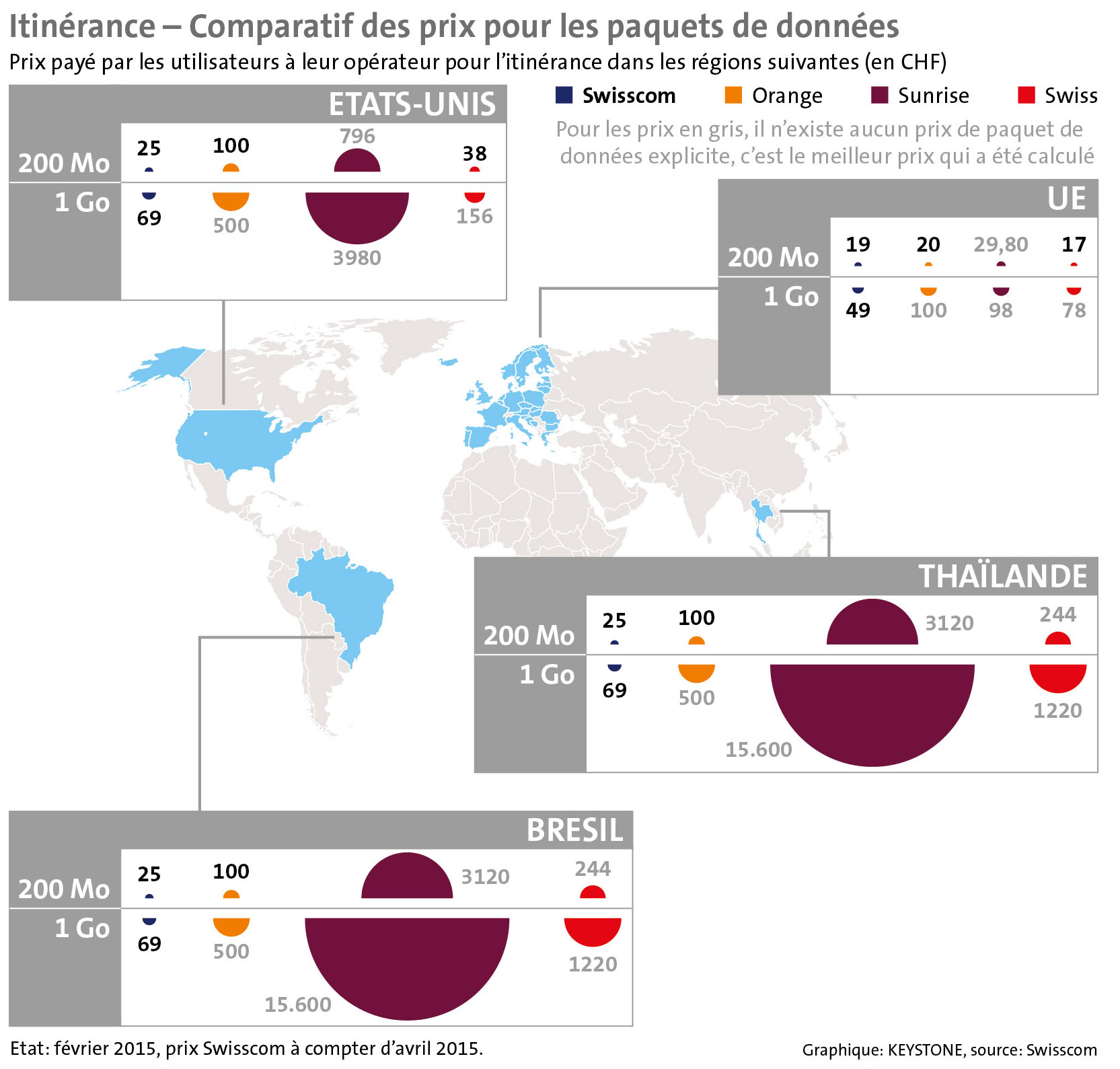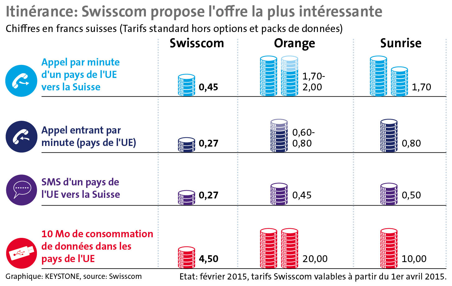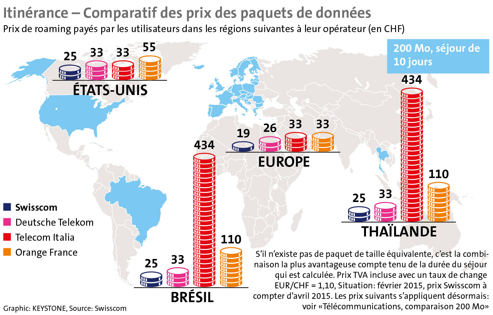 Les clients Natel infinity plus ne seront plus les seuls à pouvoir réaliser des économies à l’étranger. Swisscom baisse ses prix standard ainsi que les tarifs des paquets de données jusqu’à 38%. Un appel téléphonique dans les pays de l’UE ne coûte plus que 45 ct./min. Un volume de 200 Mo sera proposé aux clients Swisscom pour CHF 19 et le pack 1 Go (1024 Mo) pour CHF 49. Swisscom baissera également les prix du surf mobile en dehors de l’UE. Ainsi, les 200 Mo de données pour les principales destinations touristiques en dehors de l’UE ne seront plus facturés que CHF 25. Swisscom propose ainsi l’offre de loin la plus avantageuse du marché suisse pour l’itinérance, et se positionne au mieux par rapport aux principaux opérateurs européens. A titre de comparaison, les clients du leader du marché allemand paient CHF 26 pour un paquet de données de 200 Mo dans l’UE, soit presque 25% de plus que les clients Swisscom.