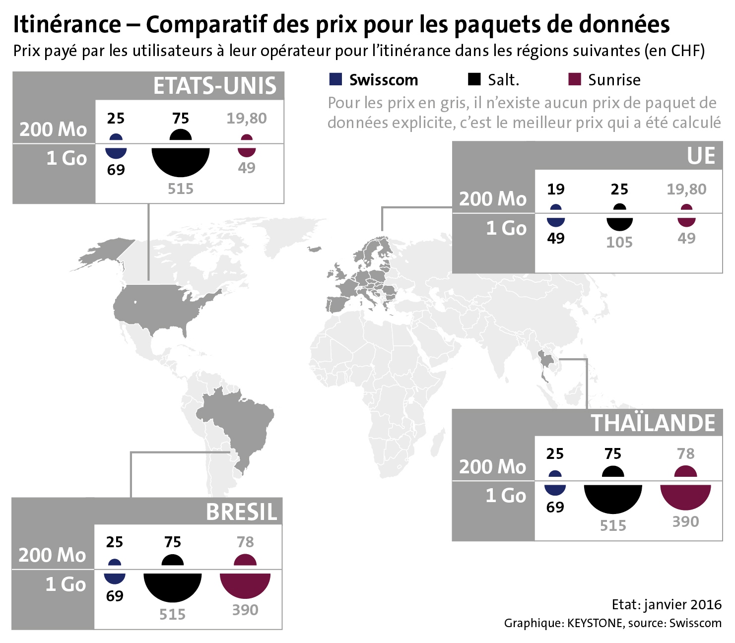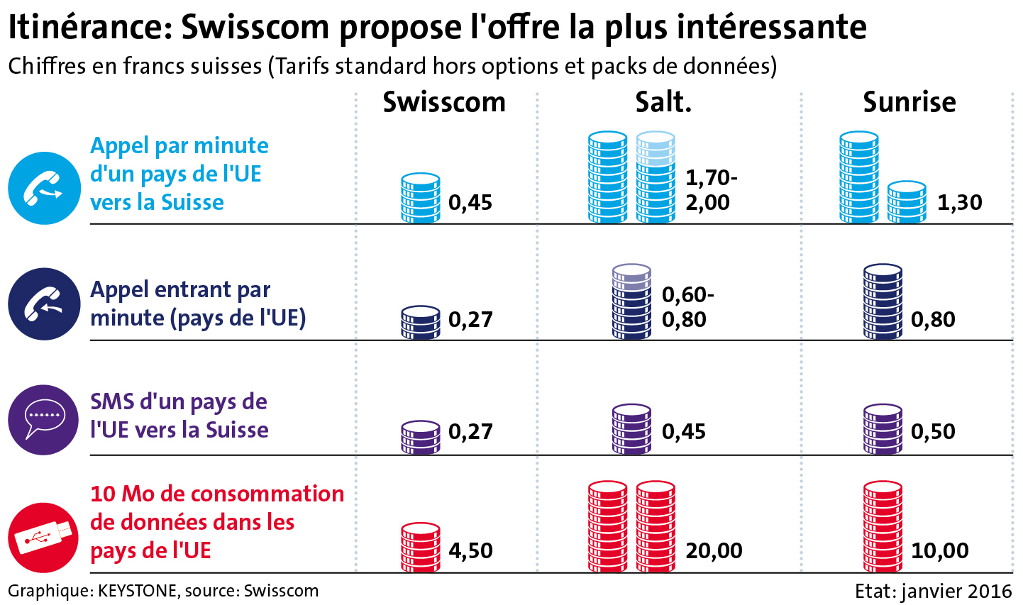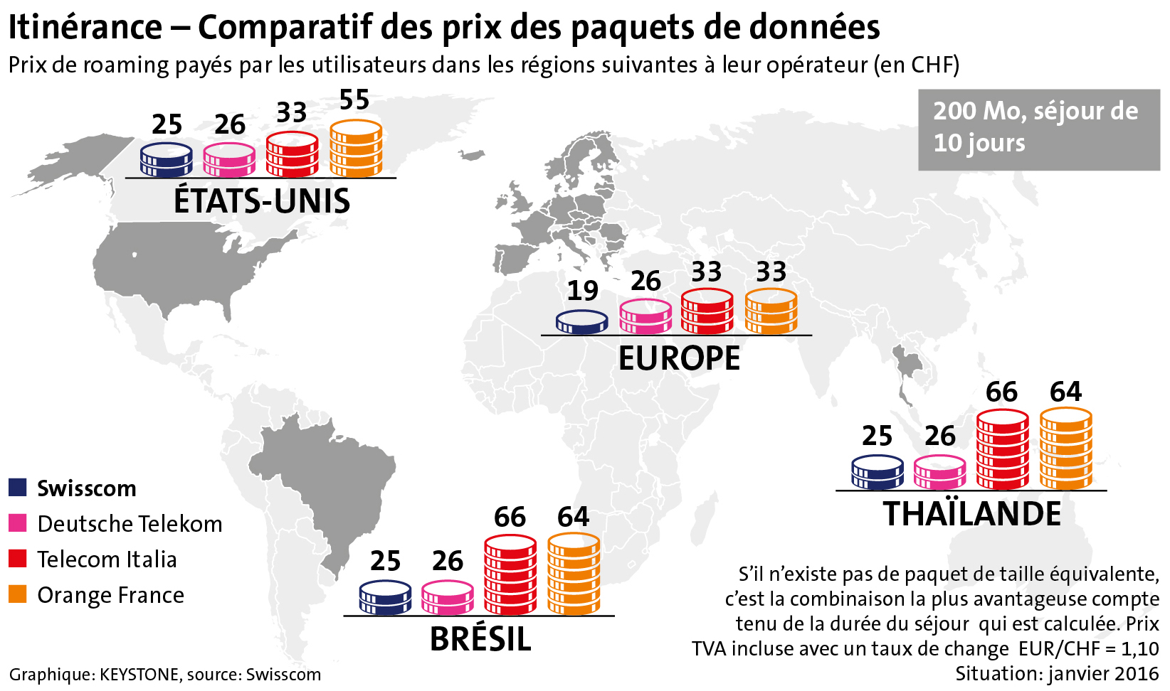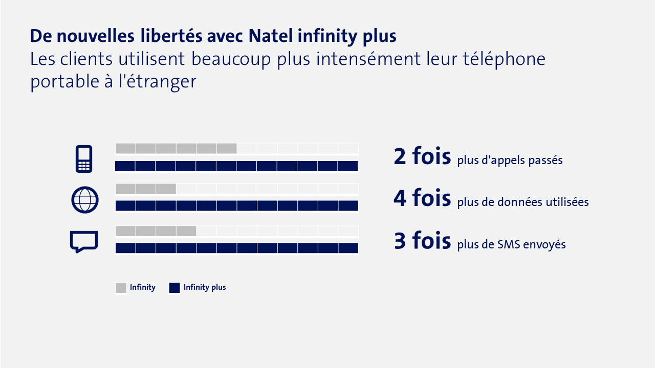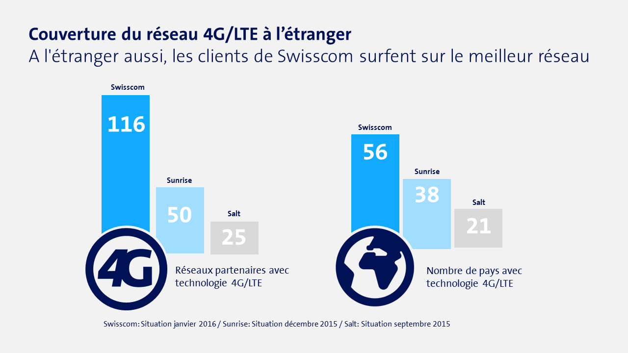 Depuis le lancement des abonnements améliorés Infinity plus en avril 2015, les clients ont utilisé leur téléphone portable dans l’UE pendant plus de dix millions de jours. Ils profitent ainsi déjà de 67 réseaux partenaires dotés de la technologie rapide 4G/LTE dans l’UE, 116 dans le monde entier. Dans l’ensemble, Swisscom offre la plus grande couverture réseau à l’étranger par rapport aux concurrents suisses et se situe même en tête au niveau international. Les clients Swisscom surfent aussi en Suisse sur le meilleur réseau: En décembre 2015, Swisscom a été récompensée, dans le cadre du test de réseau de téléphonie mobile par le magazine spécialisé Connect pour la septième fois consécutive dans la catégorie Meilleur réseau suisse et pour la seconde fois dans la catégorie Meilleur réseau en comparaison avec l’Allemagne, l’Autriche et la Suisse.