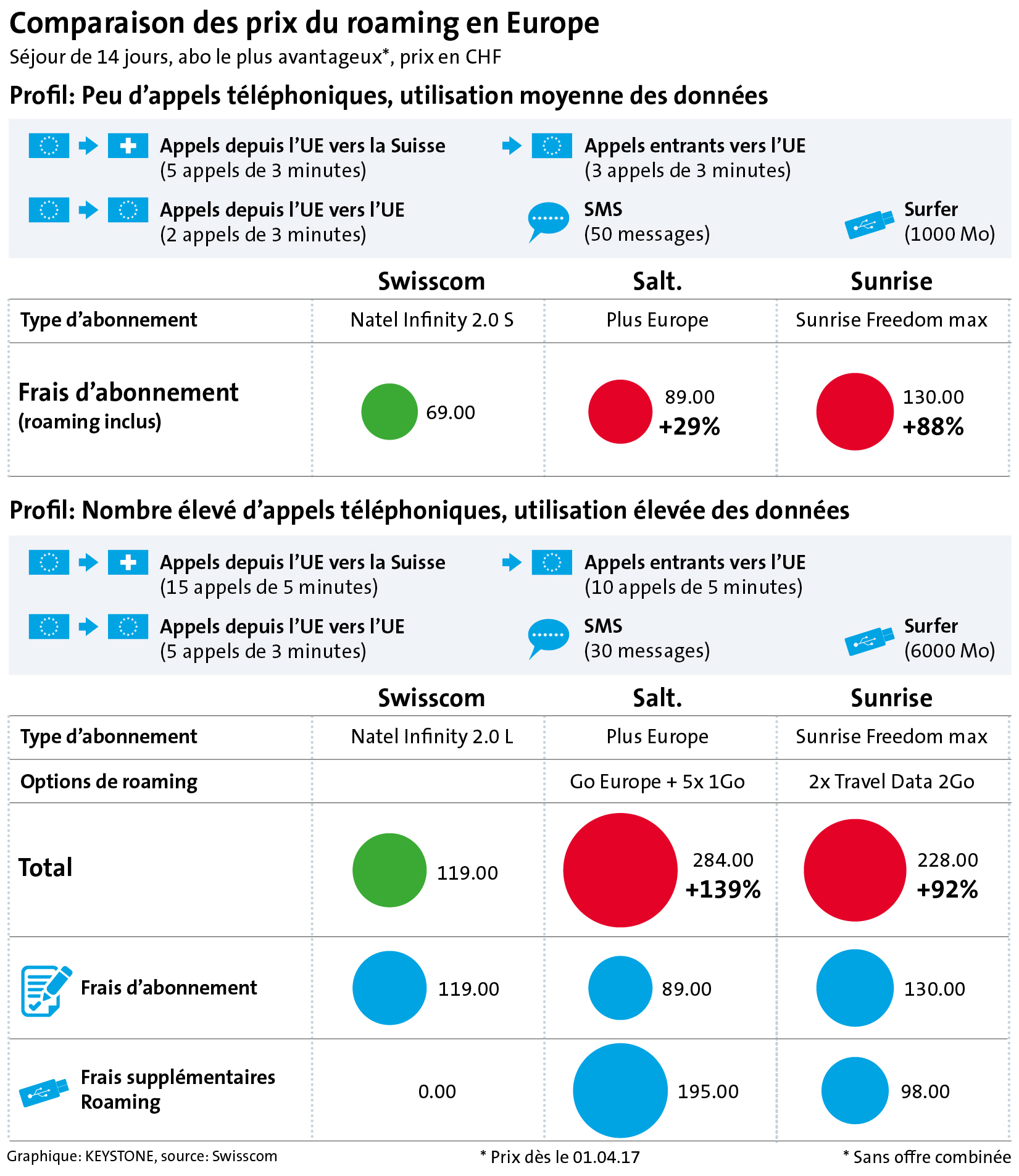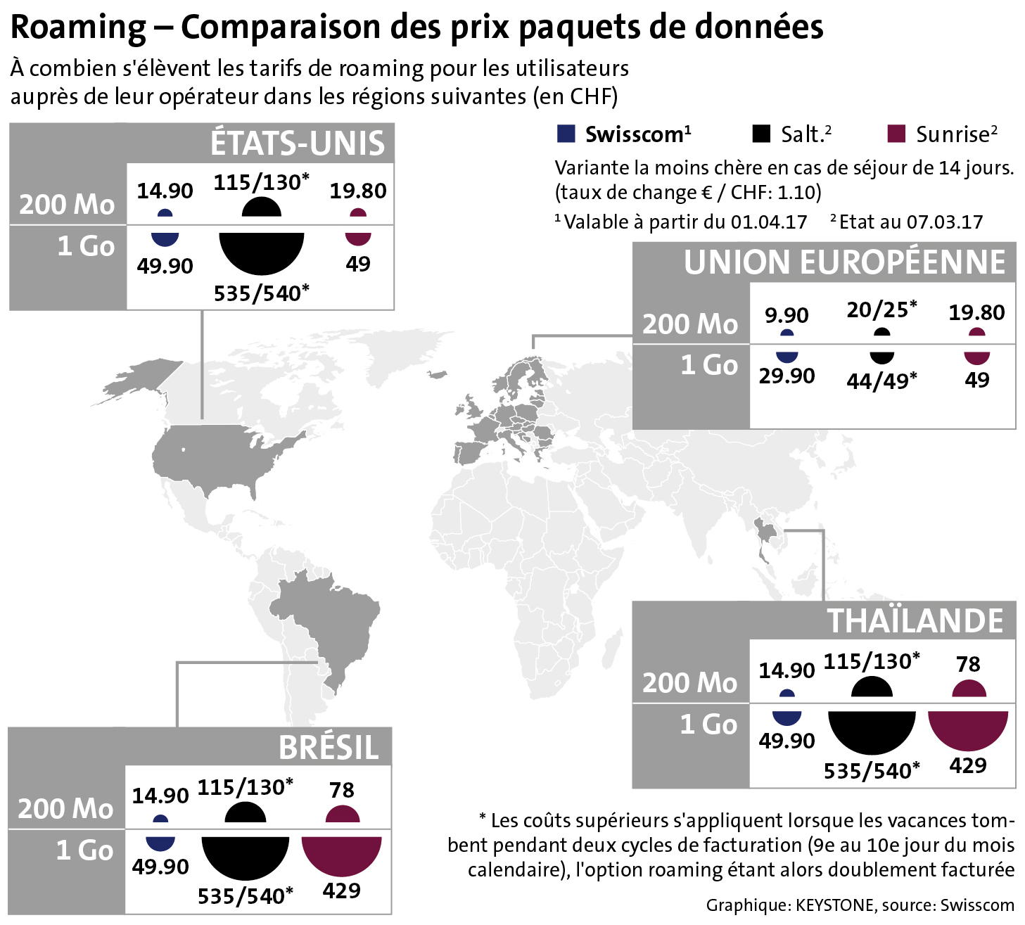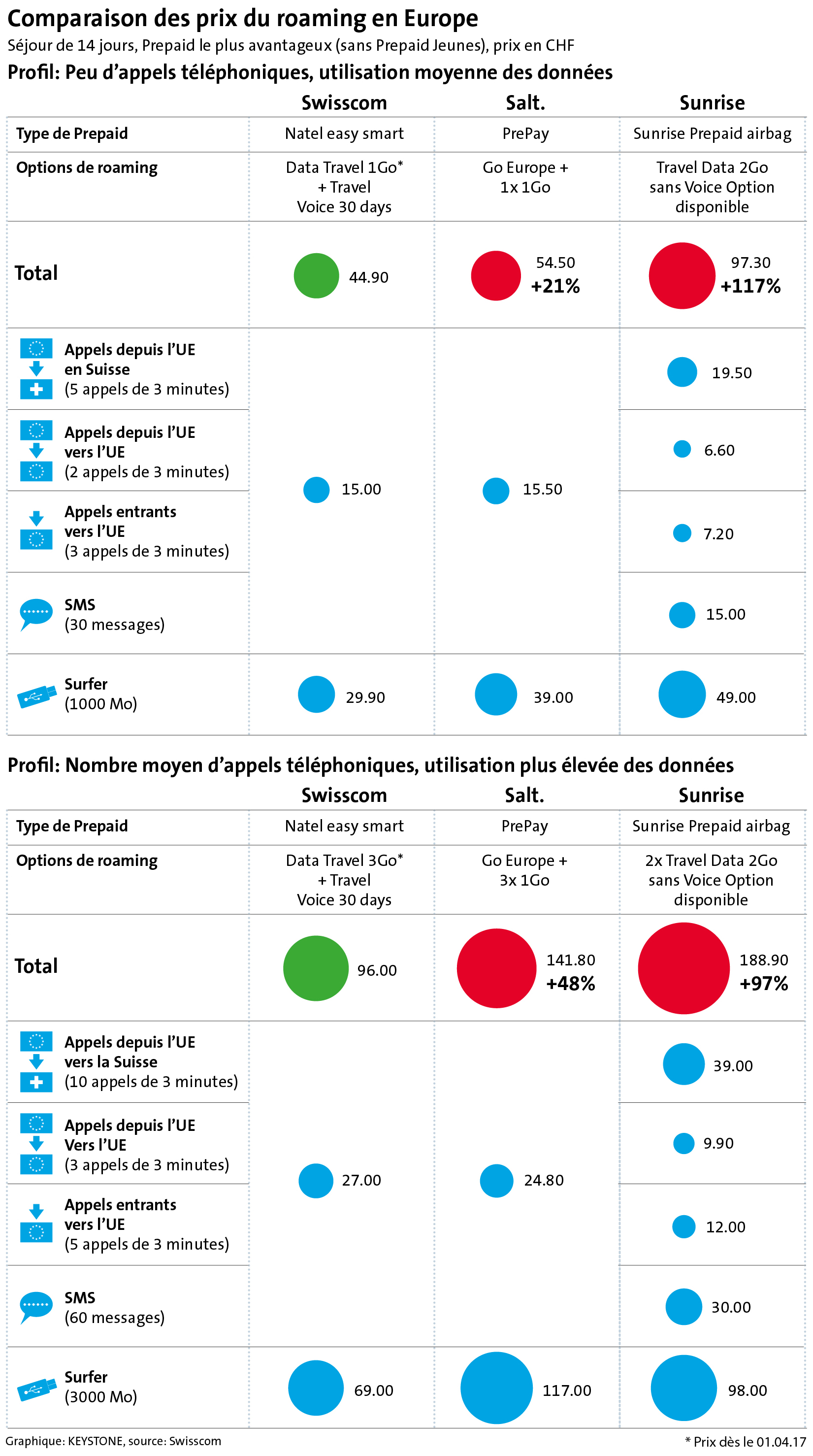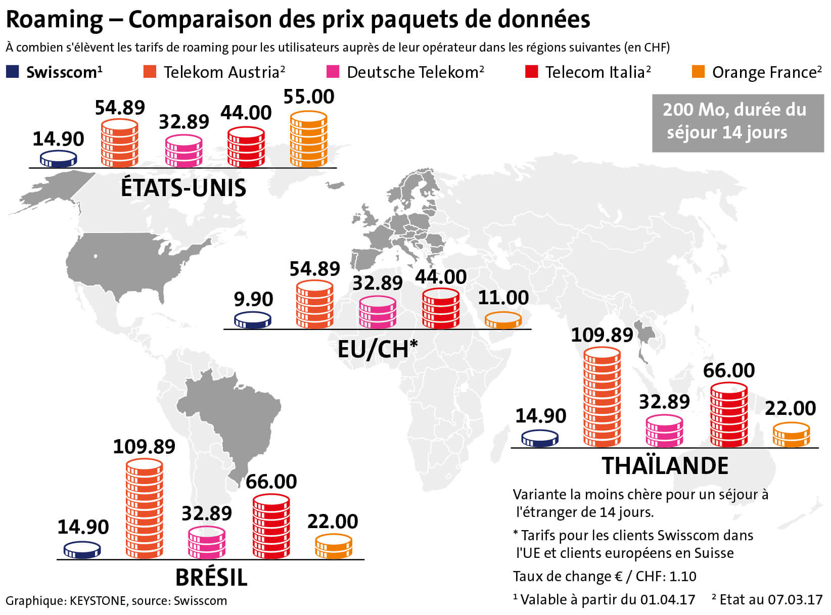 Alors que l’offre NATEL® infinity inclut l’Internet sans souci et la téléphonie dans toute l’Europe et que les nouveaux abonnements inOne mobile (à partir du 19 avril) offrent en plus 100 Mo de données par an dans plus de 190 pays, les nouveaux tarifs allègent particulièrement la facture des utilisateurs NATEL® easy et NATEL® light. «Avec la toute dernière baisse tarifaire, nous voulons permettre aux clients Prepaid ou avec de petits abonnements de conserver leurs habitudes de navigation à l’étranger», explique Jérôme Wingeier. De plus, les clients bénéficient d’une couverture réseau exceptionnelle. Aujourd’hui, Swisscom peut compter sur plus de 670 réseaux partenaires à l’étranger, permettant à ses clients de se connecter presque partout dans le monde. Avec 170 d’entre eux, soit dans 77 pays, les clients profitent même du réseau 4G. Swisscom offre ainsi à sa clientèle plus de réseaux à l’étranger que les autres opérateurs suisses, le tout à un tarif plus attrayant.