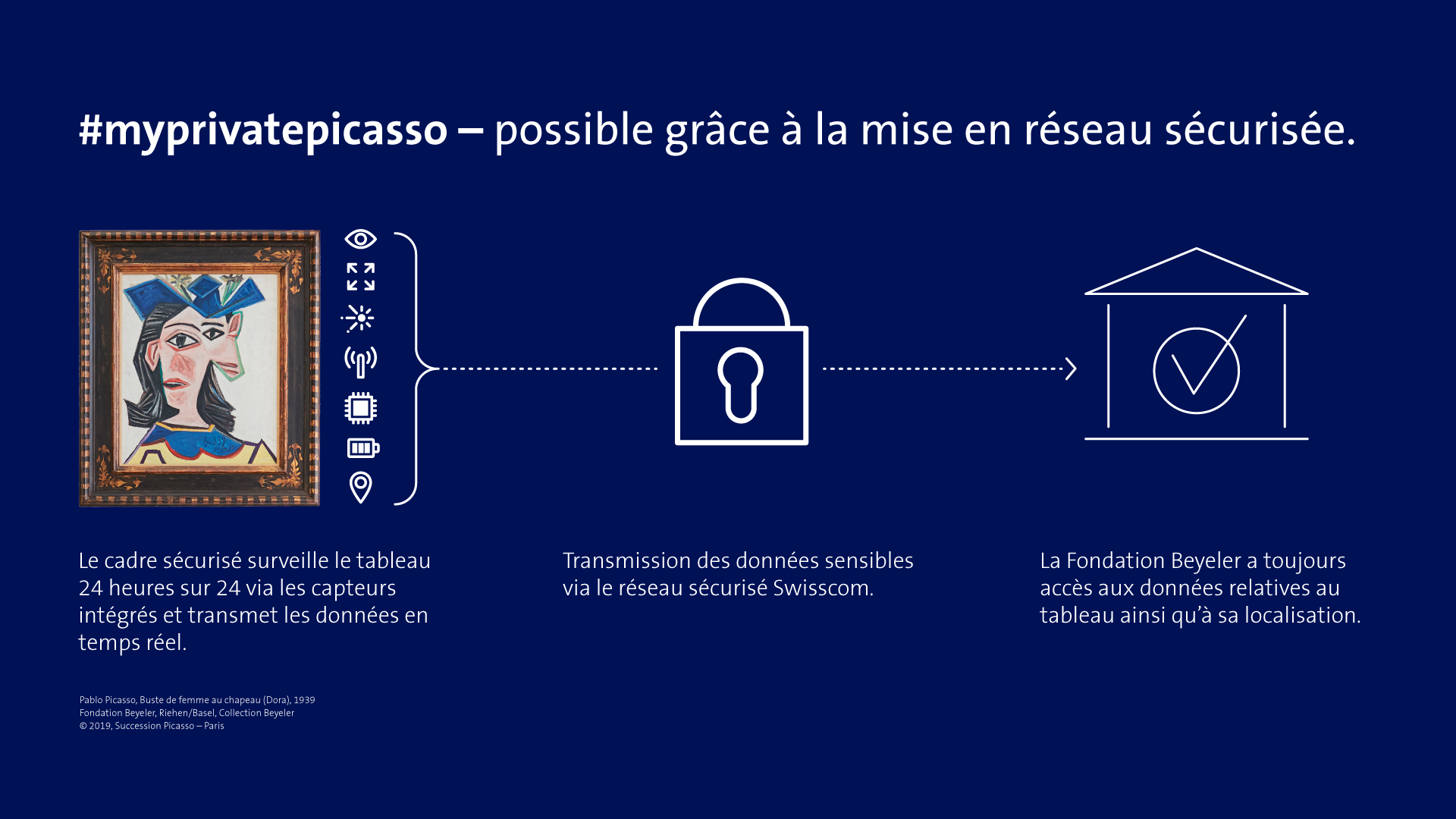 La mise en réseau et le transfert sécurisé des données sensibles via le réseau Swisscom rendent possible le prêt d’un tableau aussi précieux à un foyer suisse ordinaire – en dehors du cadre d’un musée. Les experts en sécurité de Swisscom et de la Fondation Beyeler peuvent surveiller le tableau en permanence et obtenir les données environnementales importantes de ce dernier grâce à un cadre connecté. En vue de l’action #myprivatepicasso, Swisscom et la Fondation Beyeler ont développé pour le chef d’œuvre Buste de femme au chapeau (Dora) un cadre intelligent qui mesure notamment la température et l’humidité ambiantes, la position GPS du tableau, et déclenche une alarme en cas de mouvement interdit.