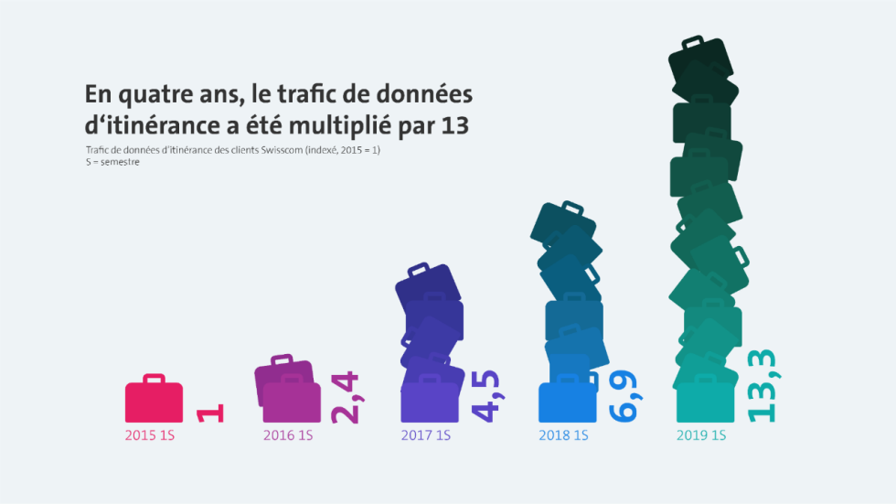 Le volume des données en itinérance utilisées à l’étranger a presque doublé en l’espace d’un an, en partie à la suite de nouvelles réductions de prix et à des prestations supplémentaires incluses dans les nouveaux abonnements de communication mobile lancés sous inOne mobile. Le nouveau inOne mobile go supprime l’itinérance en Europe pour les clients de Swisscom: ceux-ci passent des appels, envoient des SMS et surfent ainsi de façon illimitée dans 39 pays d’Europe. Même ceux qui n’ont pas encore d’abonnement qui inclut l’itinérance en Europe surfent à bien meilleur compte depuis le 1er avril. Au cours des quatre dernières années, les volumes de données en itinérance ont été multipliés par 13.
