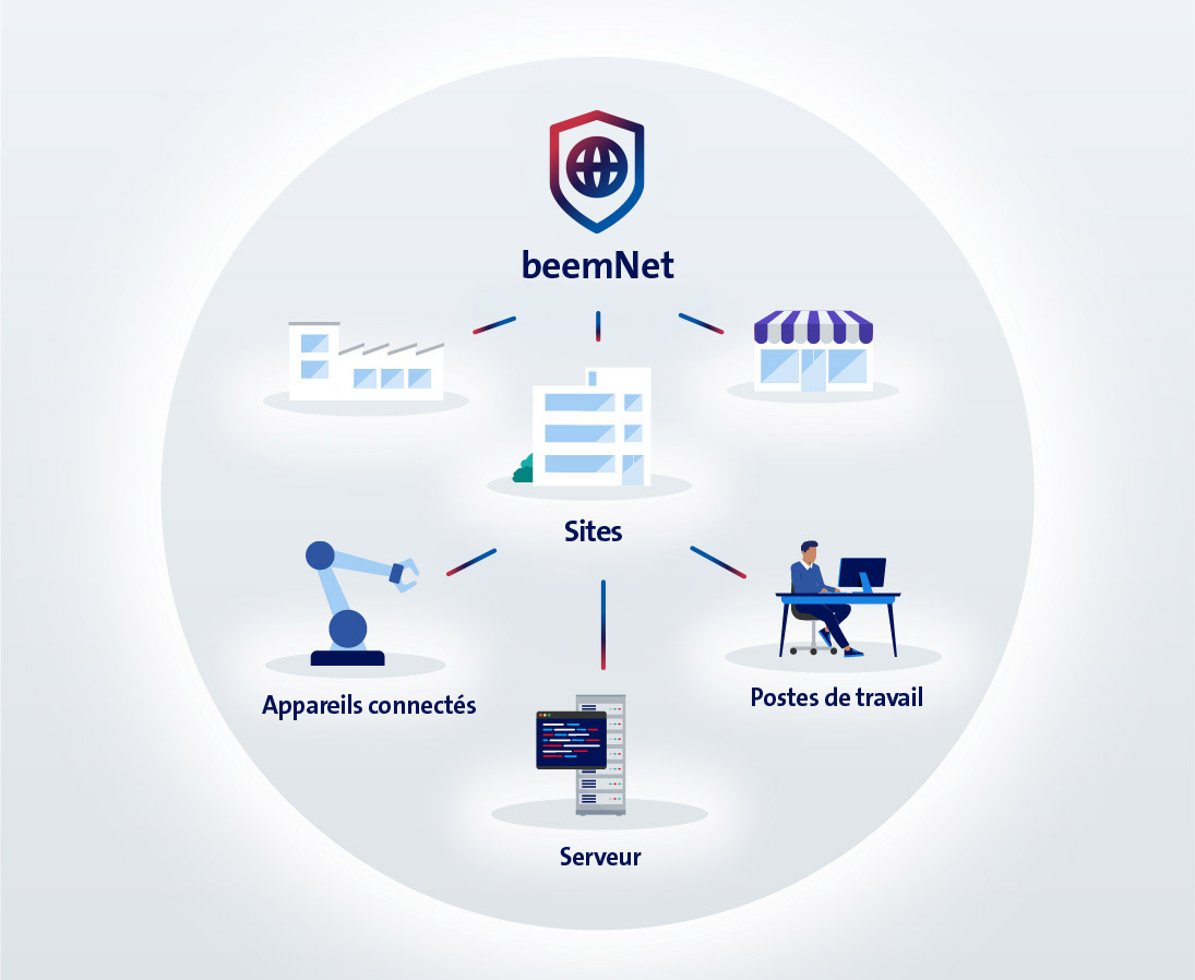 Les sites, les utilisateurs et même les appareils IoT peuvent être intégrés à beemNet tout simplement, via nos offres de sites adaptées, nos licences utilisateur ainsi que nos Security Editions, et avec une protection automatique sur le réseau Swisscom. Vous bénéficiez ainsi d’une cybersécurité complète et simple dans l’ensemble de votre entreprise.