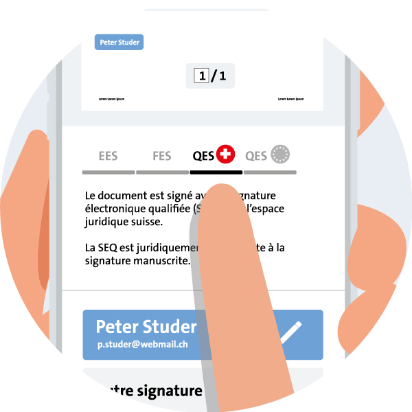 SEQ : Signature électronique qualifiée - Assimilée juridiquement à une signature manuscrite (CHF 2.40 par signature). Une SEQ nécessite une identification unique avec un document d'identité valable (passeport ou carte d'identité) et est validée via l'application MySwisscom.