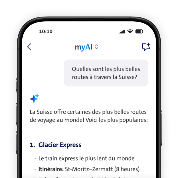 myAI est votre compagnon digne de confiance, conçu en Suisse. Pour vous inspirer et vous aider au quotidien. Vos données restent toujours protégées, elles ne servent pas à entraîner l’IA et ne sont pas transmises à des tiers.
