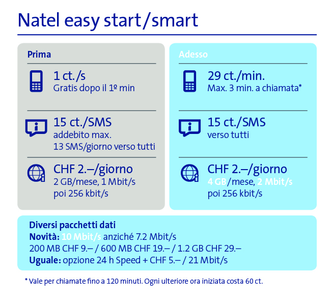 Oggi le offerte Prepaid vengono utilizzate in maniera diversa rispetto a un paio di anni fa. Mentre prima la maggior parte dei clienti acquistava una scheda Prepaid per telefonare, inviare SMS o essere reperibile saltuariamente, oggi si naviga in internet più volte al giorno anche con un cellulare o con un tablet. Swisscom adegua pertanto le sue offerte Prepaid e aumenta le velocità di navigazione. I grandi internauti che utilizzano un pacchetto dati da 200 MB, 600 MB o 1,2 GB a partire dal 26 gennaio navigano allo stesso prezzo a una velocità del 30 per cento maggiore, pari a un massimo di 10 Mbit/s. E anche i clienti che utilizzano solo occasionalmente internet con la tariffa standard di CHF 2 al giorno dispongono ora della velocità doppia (max. 2 Mbit/s) e di un maggiore volume di dati mensile.