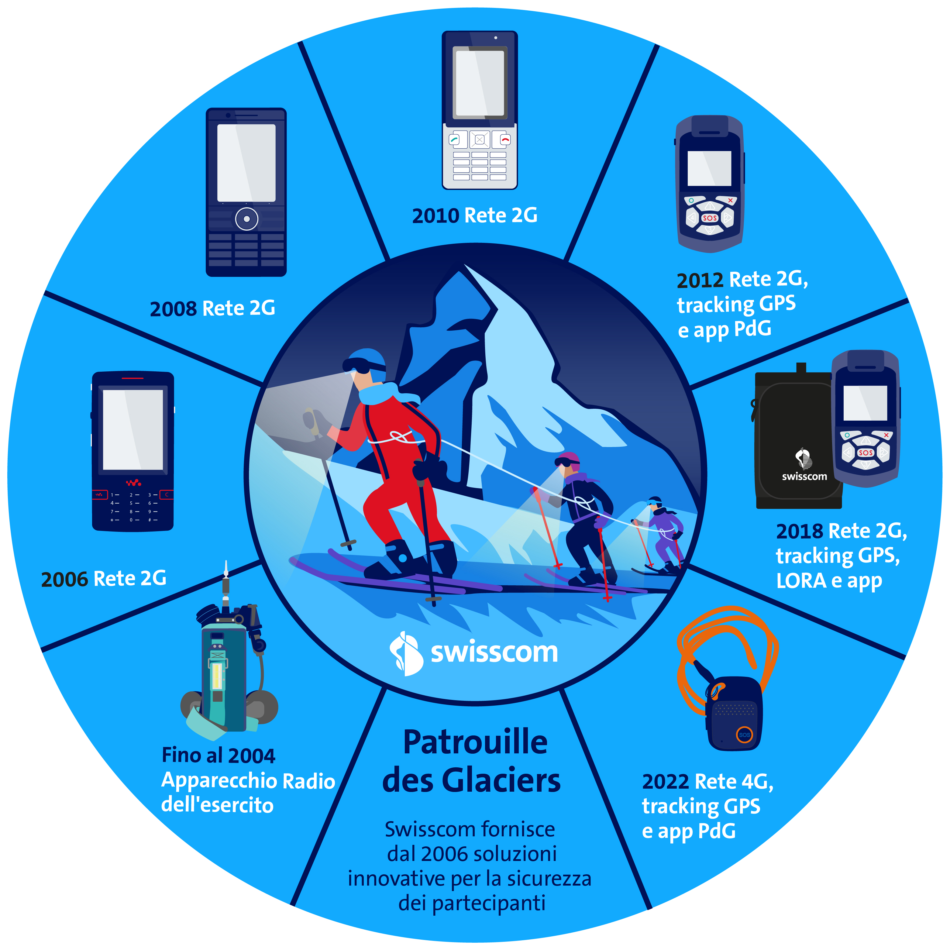 La Patrouille des Glaciers, che si snoda lungo le Alpi del Vallese, è una competizione famosa in tutto il mondo per la sua difficoltà. Non per niente gli esperti la considerano la gara di scialpinismo più impegnativa del mondo. Gli atleti devono affrontare condizioni durissime, che richiedono mesi e mesi di preparazione in vista del fatidico giorno. Per partecipare a questa impegnativa gara in alta montagna servono innanzitutto disciplina e resistenza. Lo stesso vale per i membri dello Stato maggiore specializzato Telecom, che devono predisporre una rete mobile temporanea in sei postazioni ad alta quota, sfidando le avverse condizioni meteo delle Alpi ad altitudini talvolta superiori ai 3000 metri.