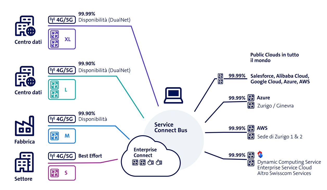 Cloud Access è un servizio di Enterprise Connect, la soluzione di rete software-defined networking (SDN) di Swisscom. Il servizio consente una gestione efficiente degli ambienti cloud ibridi. Cloud Access può essere combinato a piacimento con ulteriori servizi di Enterprise Connect, come ad esempio WAN o LAN. Cloud Access è gestito e monitorato in centri di calcolo in Svizzera.