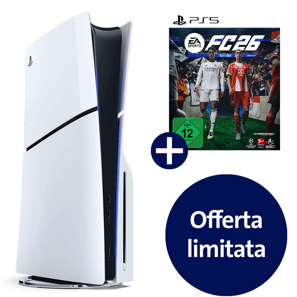 • Stipulando un nuovo abbonamento blue Internet M (79.90/mese) o blue Internet L (89.90/mese) i clienti ricevono una PlayStation 5 Slim incl. FC26 (del valore di CHF 549.–) al prezzo di CHF 0.–.
