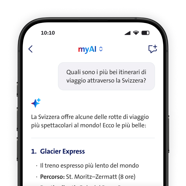 Provate myAI, l’AI svizzera per l’uso quotidiano. Parlate in modo del tutto naturale, traducete testi, sviluppate idee o riassumete informazioni: in tutta semplicità e gratuitamente con il vostro Swisscom Login.