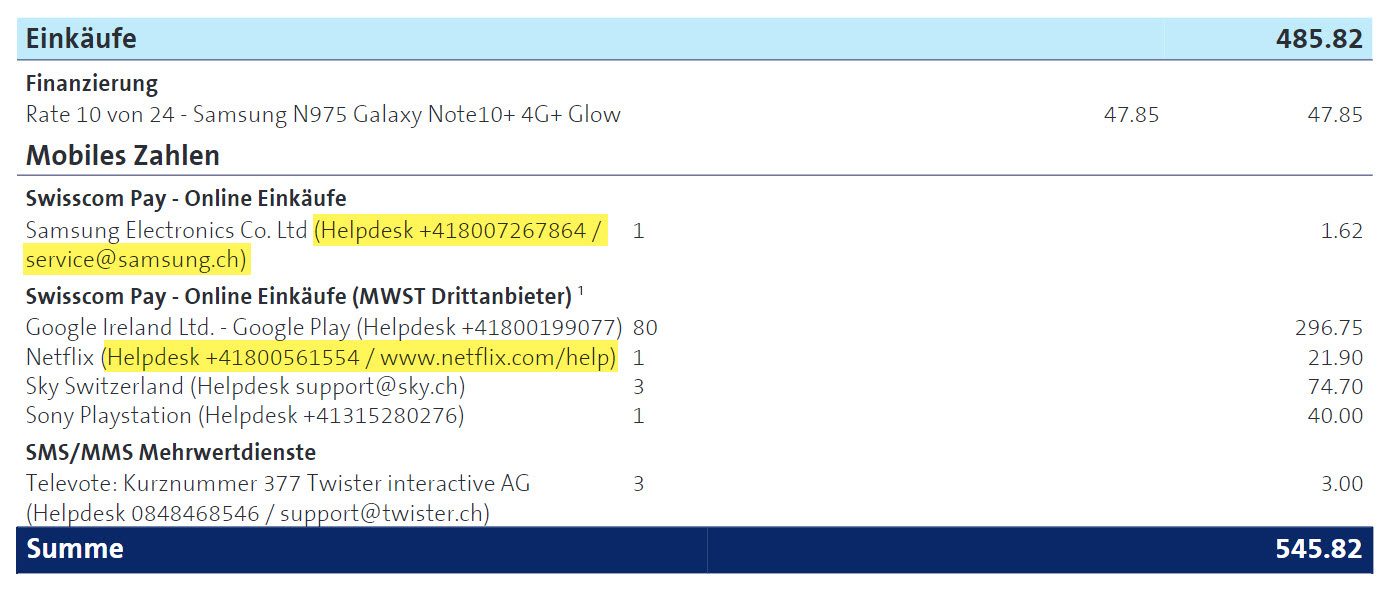 I servizi a valore aggiunto figurano sulla fattura Swisscom alla voce «Acquisti e offerte aggiuntive».